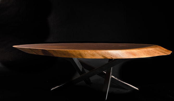This black walnut live-edge coffee table was made by slicing a walnut log at an angle, creating this wonderful oval table. Black steel camp fire legs.
